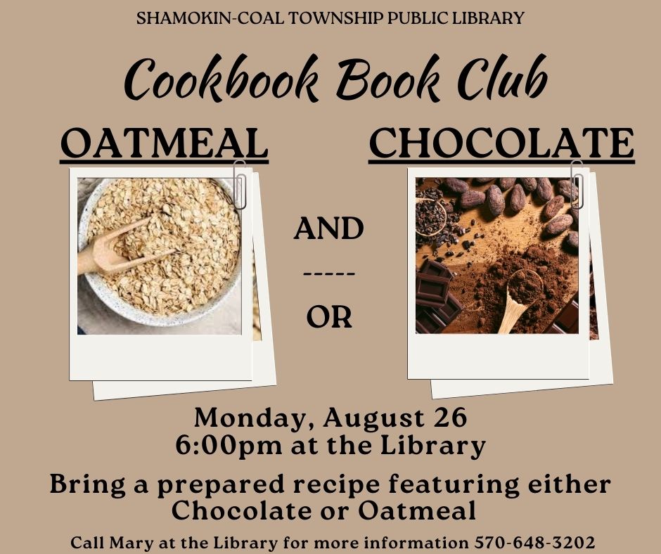 Cookbook Book Club will be meeting at the library this coming Monday (8/26) at 6 PM to share and discuss dishes featuring either chocolate or oatmeal! Everyone is encouraged to bring a prepared dish from their own recipe collection or one selected from our many local cookbooks. For additional info or to sign up, stop by the library or give us a call!