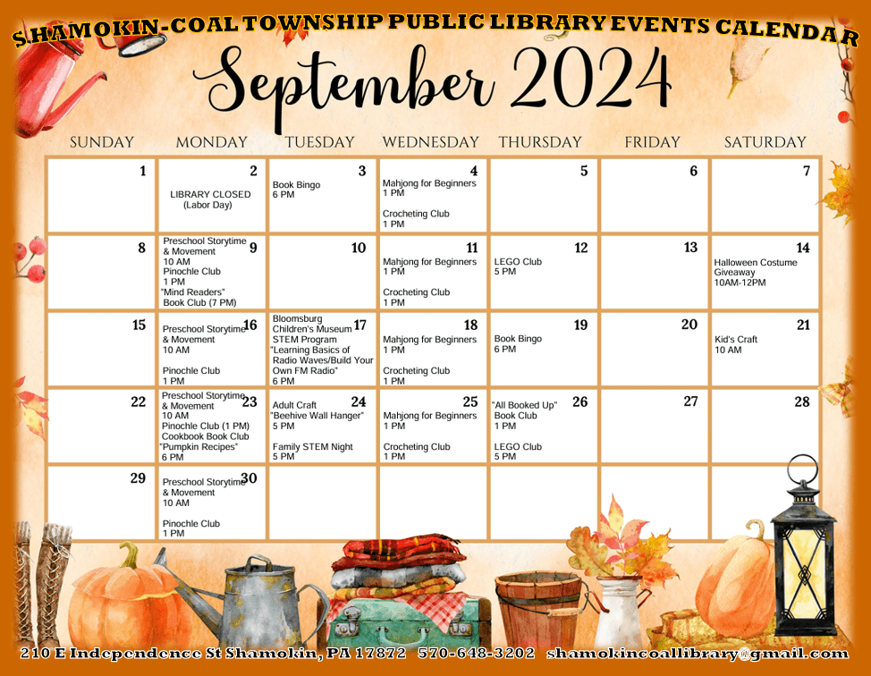 Keep up to date with everything happening at your local library this September and beyond! Event calendars are readily available every month at the front desk along with handouts that include additional information about upcoming programs for children, adults, or the whole family.