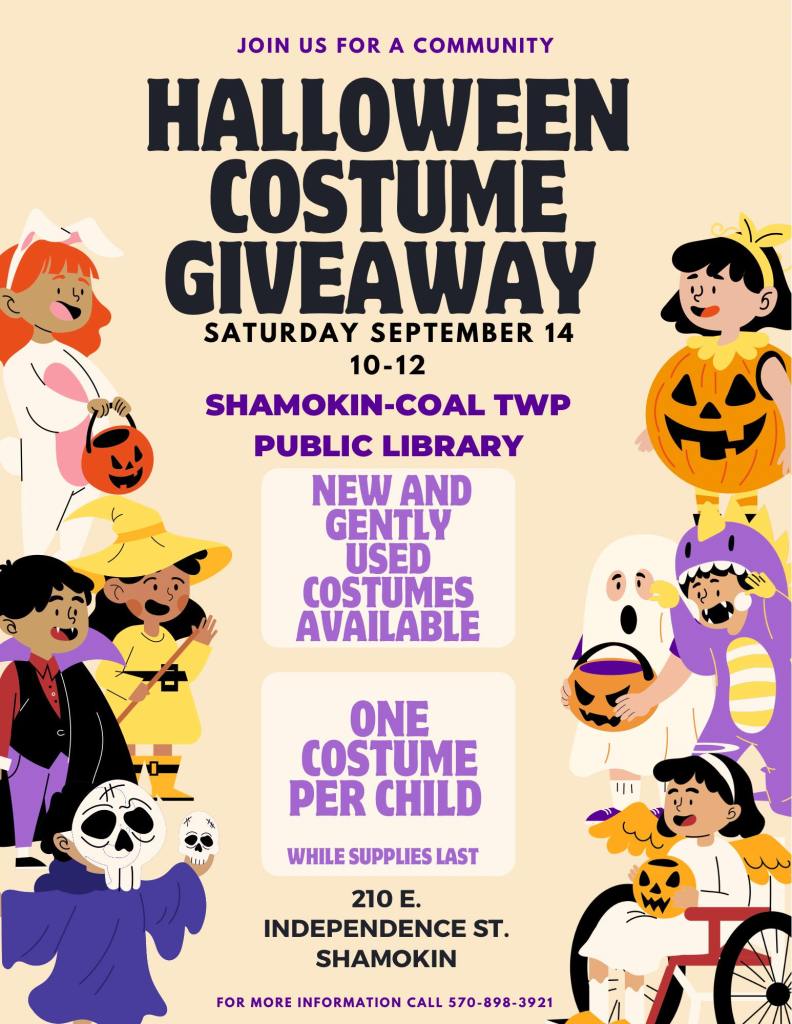 Don’t forget that this coming Saturday (9/14) there’s a community Halloween Costume Giveaway! New and gently used costumes will be available (1 per child) while supplies last from 10AM-12PM at Shamokin-Coal Township Public Library. For more information concerning this upcoming event, please call 570-898-3921.