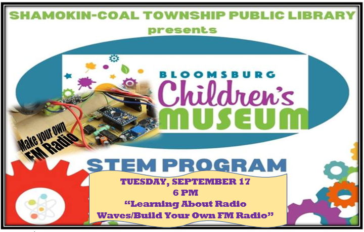 This coming Tuesday (9/17) at 6 PM Bloomsburg Children’s Museum will be making their monthly visit to our library. This time around, we’ll be learning all about radio waves and making our own FM radios to take home! To sign up for this free event, either stop by the library or give us a call at 570-648-3202.