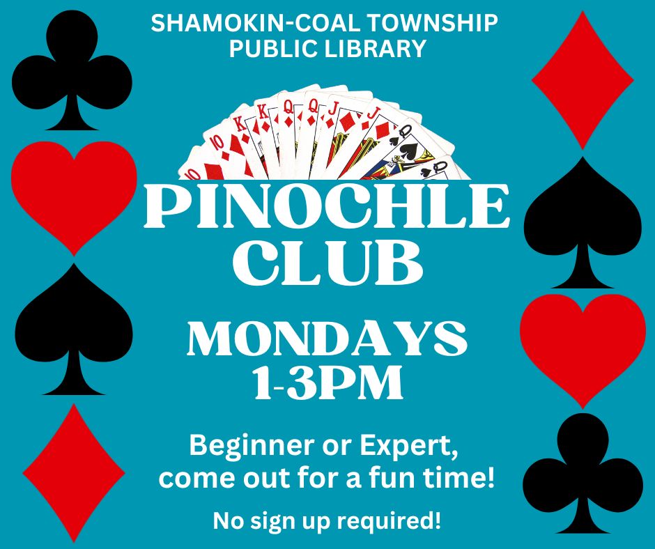 Just a reminder that Pinochle Club is held upstairs at the library every Monday afternoon from 1-3 PM. Whether you’ve been playing for years or are interested in learning, feel free to join us tomorrow!