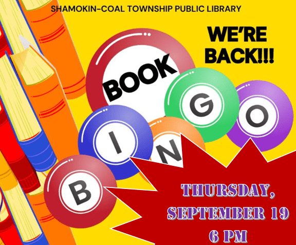 Just a reminder that Book Bingo will be held tomorrow evening (9/19) at 6 PM upstairs at the library. Even if you don’t win any rounds, you’ll still be able to pick out a book or movie to take home!