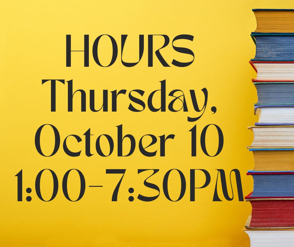 Just a reminder that tomorrow (10/10) the library will be opening at 1 PM. If you’re simply returning books but are short on time, the book drop is always an option!
