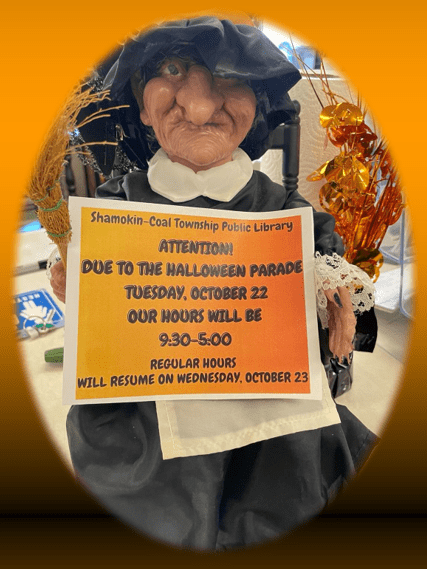 Next week on Tuesday (10/22) the library will be open special hours that will differ from our regular Tuesday/Thursday evening hours due to the Shamokin Halloween Parade starting at 6 PM. We will instead be open from 9:30AM-5PM so please keep this in mind if you need to grab books, movies, or use the computer that day.