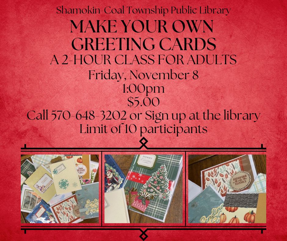 Interested in doing some custom cardmaking especially with the holidays coming up? If so, this adult craft to be held at the library on Friday, November 8 at 1 PM might be right up your alley!