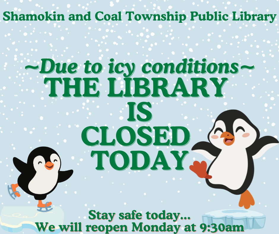 Library Closed December 27, 2025 sctplibrary Due to the icy conditions, the Library is closed today, Saturday, December 27. Share this:TweetLike Loading... Related