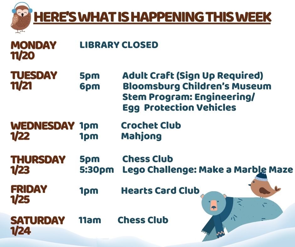 There’s a lot of activity this week at your library! In addition to our regular weekly offerings, we have two Book Clubs which you are welcome to join and Book Bingo. This week we have our monthly Children’s Craft on Saturday morning. Sign up by calling, stopping by or emailing: shamokincoallibrary@gmail.com.