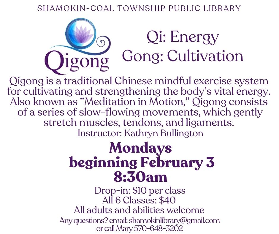 Want to try something new this year? We have a new program starting at the LIbrary on Monday, February 3. We are hosting classes where we will be learning and doing the ancient Chinese practice of Qigong. Here’s some information from the Cleveland Clinic on the benefits of participating in Qigong: “It could reduce the symptoms of depression, it has a positive effects on bone and cardiovascular health and improves balance, it can aid in improving your immune system. In a study, people with chronic fatigue experienced better mental functioning and less fatigue after participating for 4 months. Qigong is not yoga, rather it uses slow, purposeful movements that are less challenging.” Join us in this new venture!
