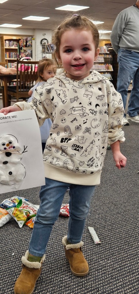 We had ‘snow’ much fun at the Storytime on Monday! We learned all the things we would need to make a snowman from the book, “All You Need for a Snowman,” by Alice Schertle.