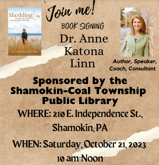 Join us at the library next Saturday (10/21) at 10 AM for a special author visit and book signing! Dr. Anne Katona Linn will be discussing her book “Shedding Lies: Living Beyond Childhood Trauma” throughout an interactive Q&A session. Copies of the book are readily available for purchase at the library for $13 while supplies last.