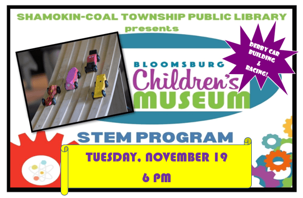 Join us next week on Tuesday (11/19) at 6 PM for the next STEM program brought to us by Bloomsburg Children’s Museum. This month’s program is bound to be extra exciting as we’ll be designing and racing derby cars down a 40 foot track just like we did earlier this year!