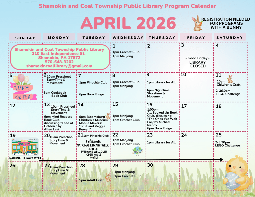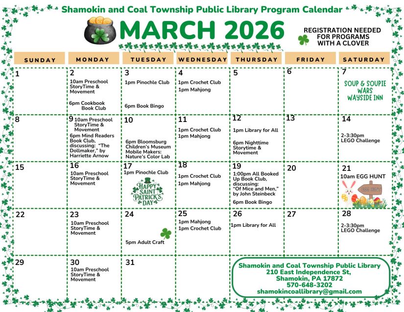 • Check out the official Shamokin-Coal Township Public Library page on Facebook for upcoming events for both children and adults!